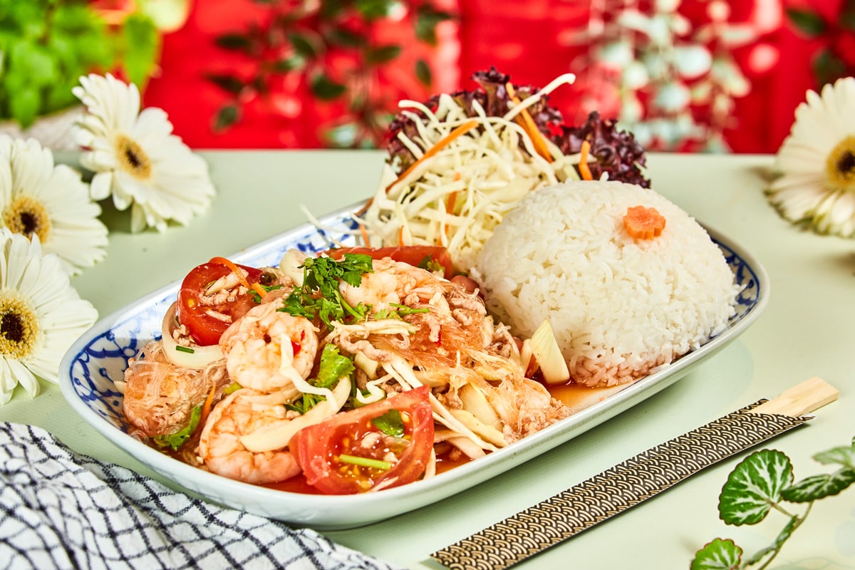 Thaisalat med glassnudler, scampi, kjøttdeig av svin, limejuice, koriander, selleri, tomat, vårløk, løk, gulrot, kål, hvitløk og chili.