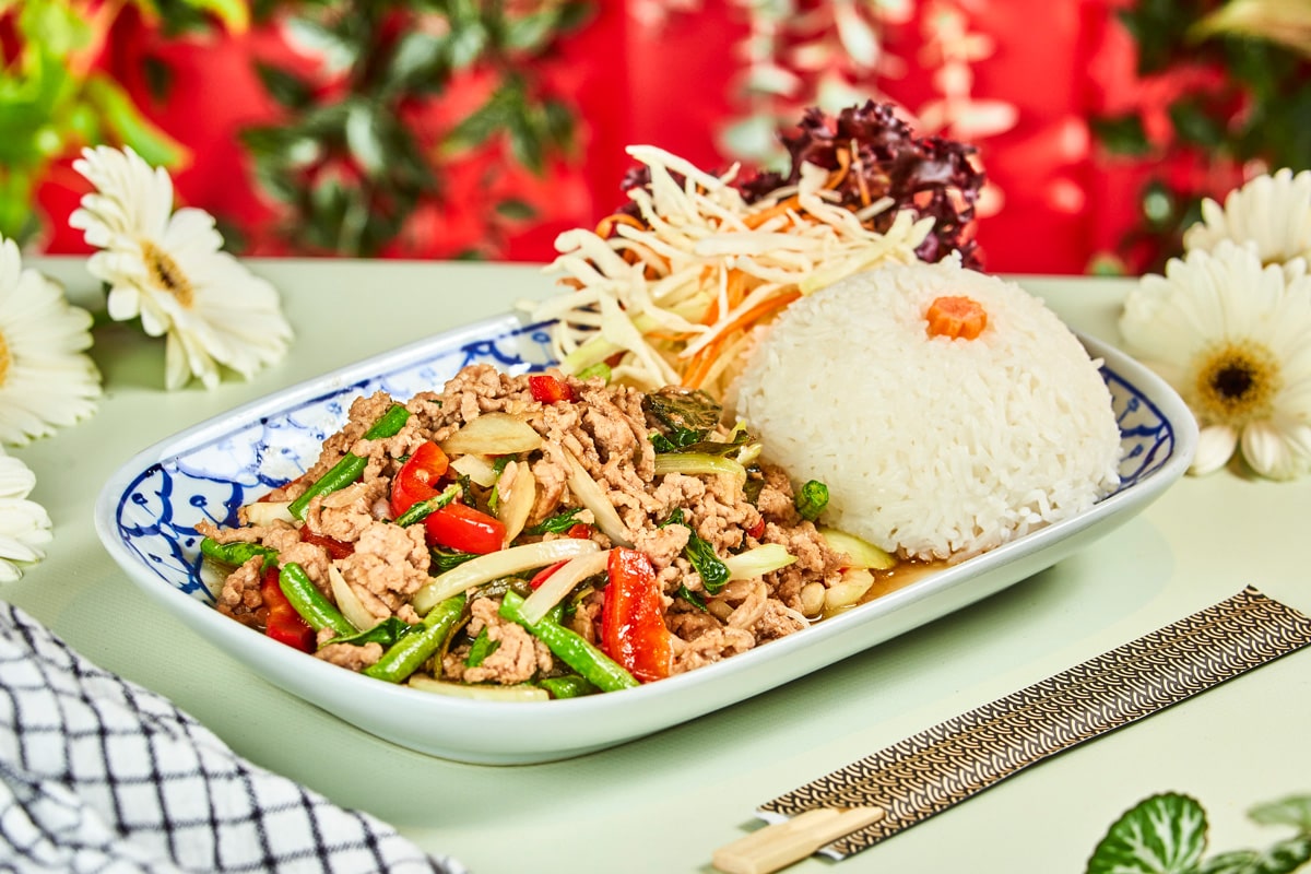 TuKTuk hangover spesial! Deilig wok bestående av thai basilikum, paprika, løk, langbønner, hvitløk og chili. Velg ønsket styrkenivå og protein.