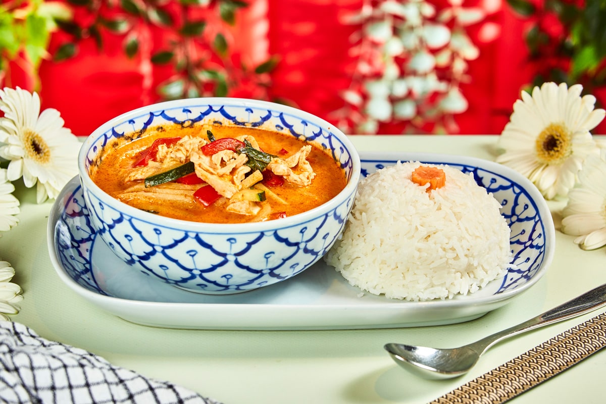Deilig rød karri med paprika, squash, bambusskudd, søt basilikum og kokosmelk. Velg ønsket styrkenivå og protein.