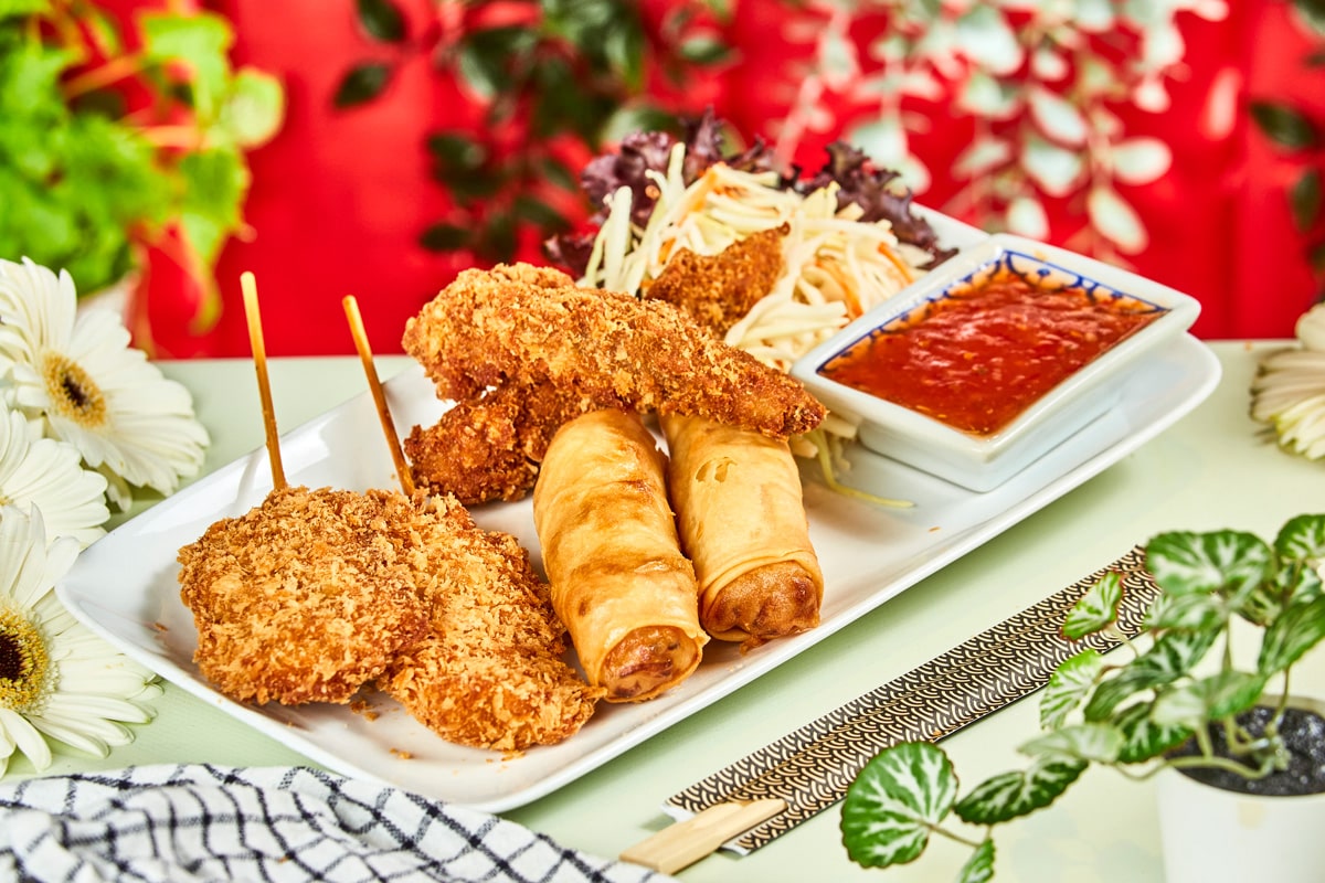 2 stk. av hver smårett, servert med sweet chilisaus.